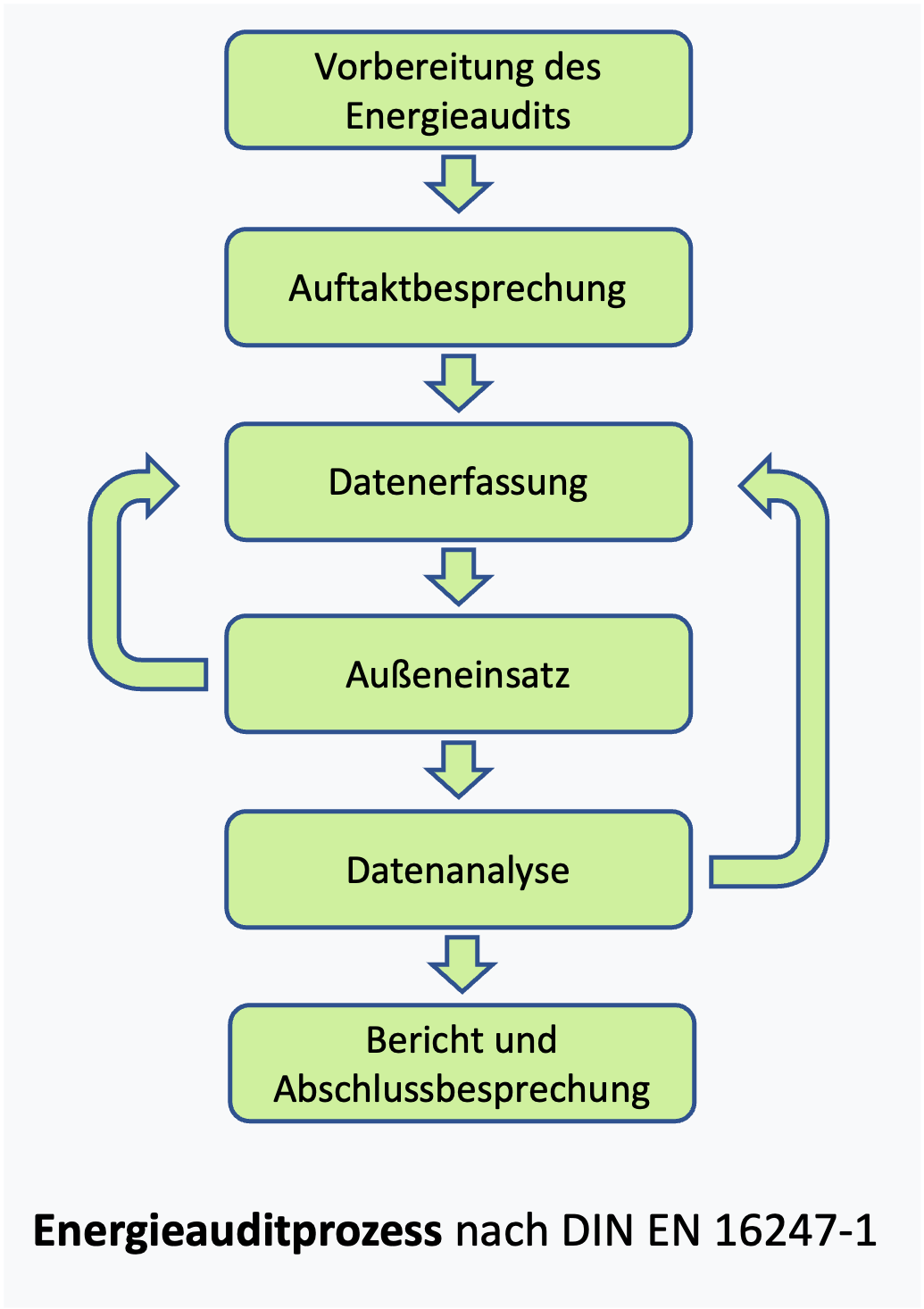 Bei einem Energieaudit handelt es sich um ein systematisches Verfahren zur Erlangung ausreichender Informationen über das bestehende Energieverbrauchsprofil eines Gebäudes oder einer Gebäudegruppe, eines Betriebsablaufs in der Industrie oder einer Industrieanlage oder privater oder öffentlicher Dienstleistungen, zur Ermittlung und Quantifizierung der Möglichkeiten für wirtschaftliche Energieeinsparungen und Erfassung der Ergebnisse in einem Bericht.
