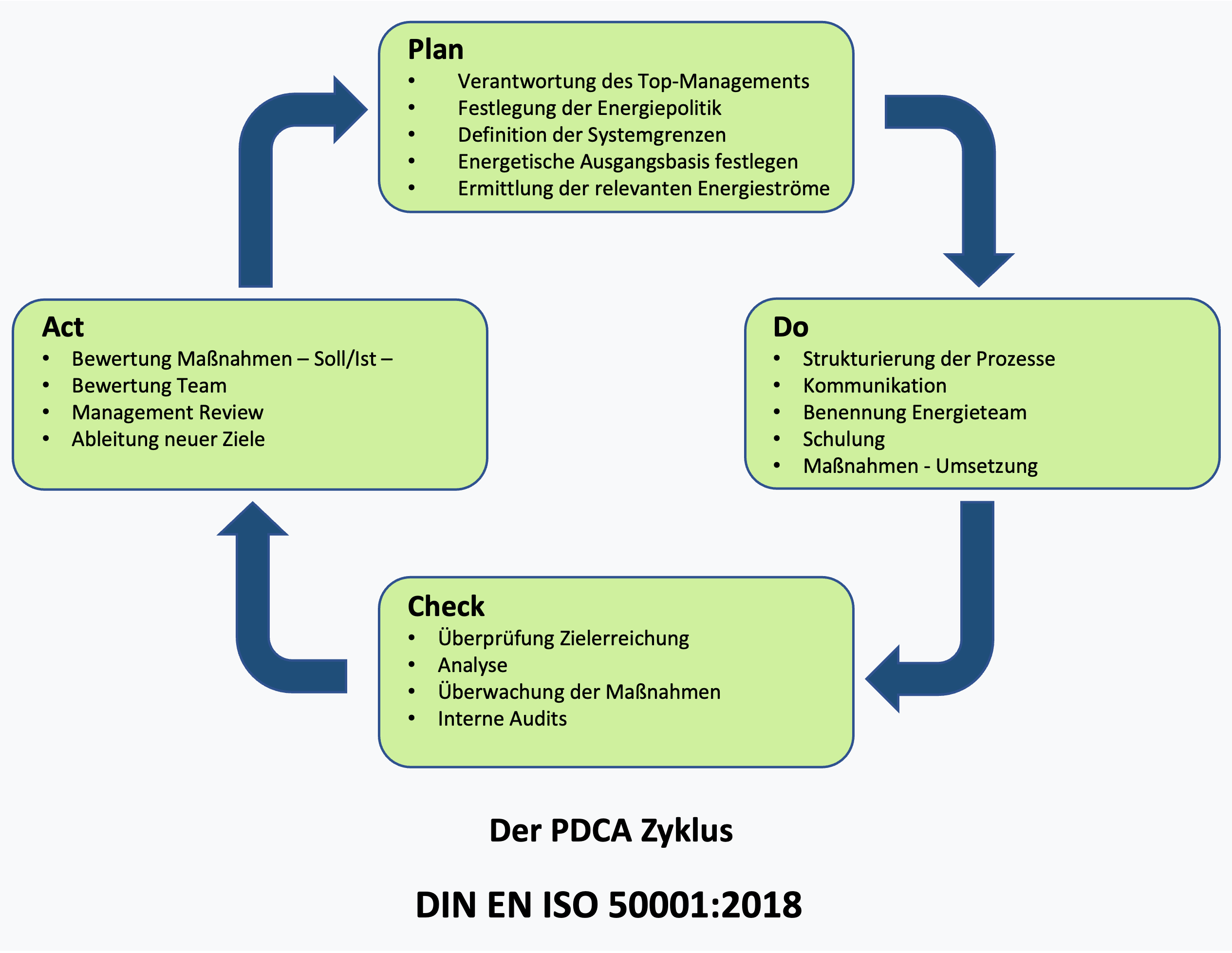 Die ISO 50001:2018 beruht auf dem Zyklus von Planen-Durchführen-Prüfen- Handeln (PDCA: Plan-Do-Check-Act) als Rahmen zur fortlaufenden Verbesserung und baut das Energiemanagement in bestehende Organisationsabläufe ein.